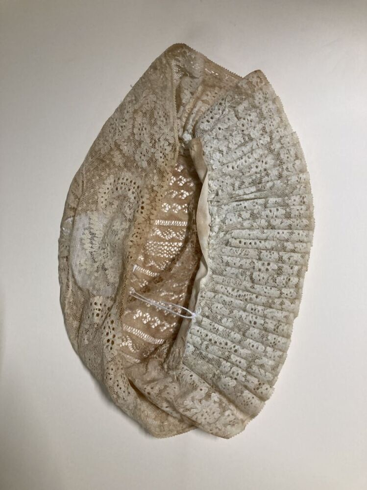 Floddermuts, machinaal kant, ajour breiwerk van zeer dunne katoen, strook met veermotief is gepijpt