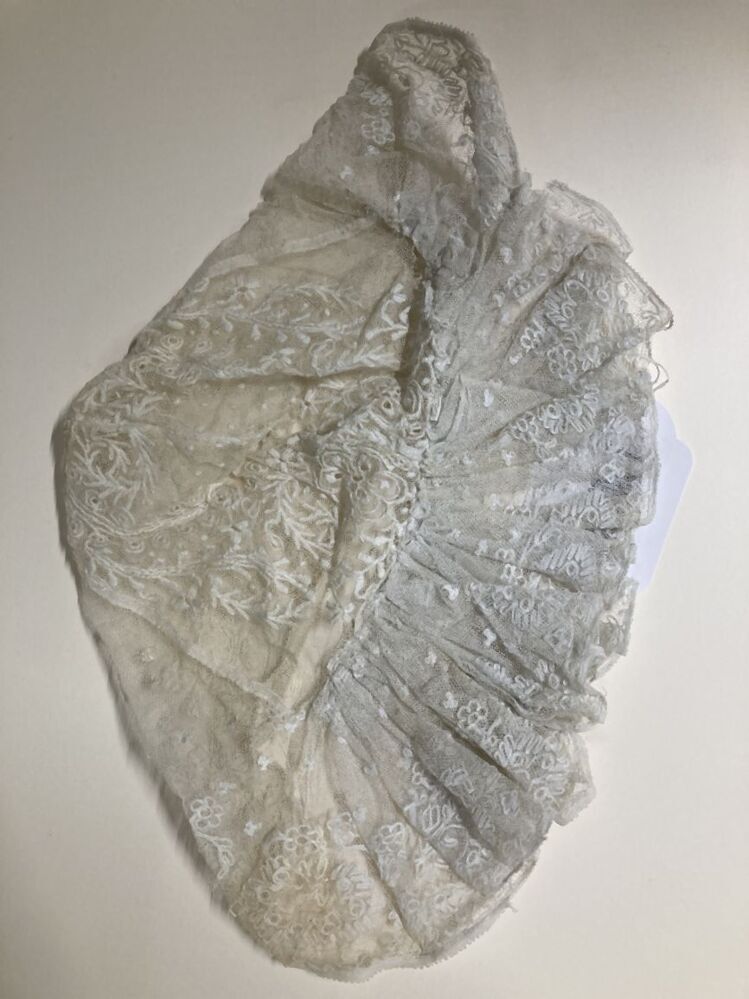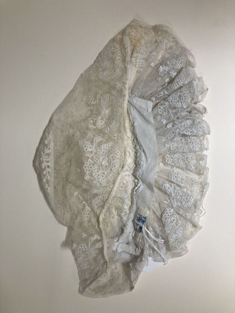 Floddermuts, tule, doorgestopt (bloemranken) gerimpelde strook, bloemmotief