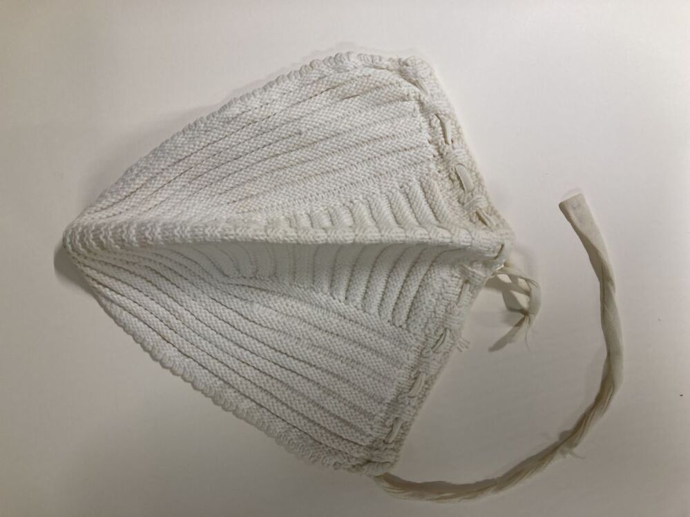 Dagmuts, gebreid van wit katoen, afgewerkt met een gebreid muizetandje
