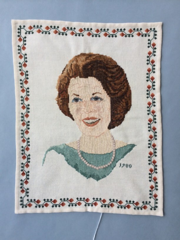 Borduurlap van wit katoen, waarop in kruissteek met katoen geborduurd de beeldtenis van koningin Beatrix, rand is kopie van 1957-74 ML 1729