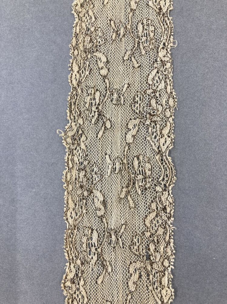 strook machinale kant, floraal motief met koper-omwoeld contourdraad