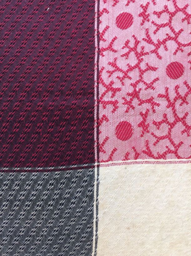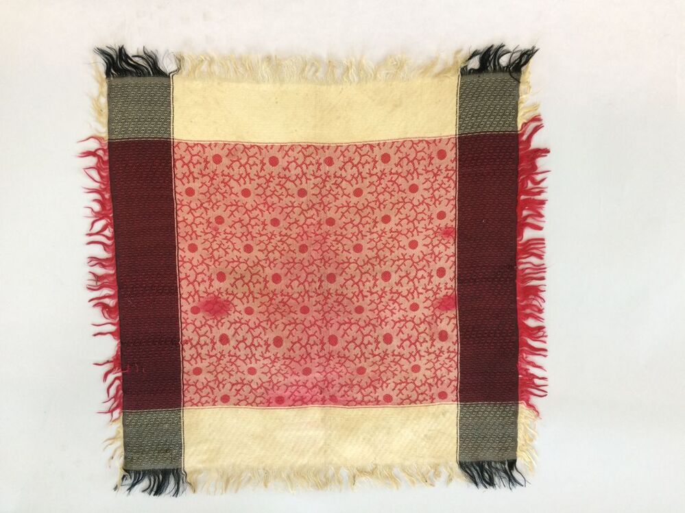 Sjaaltje van rood-zwart en wit zijden damast in keperbinding met stippen en wierpatroon, met aan vier zijden franje