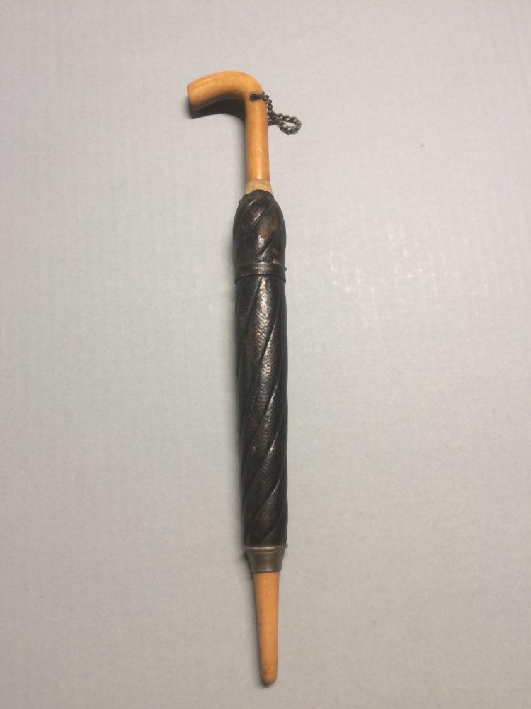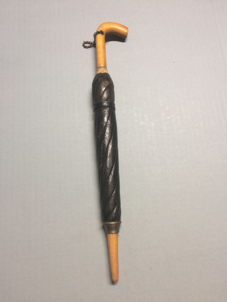 Speelgoed paraplu, houten kern, waaroverheen zwart leer geplakt