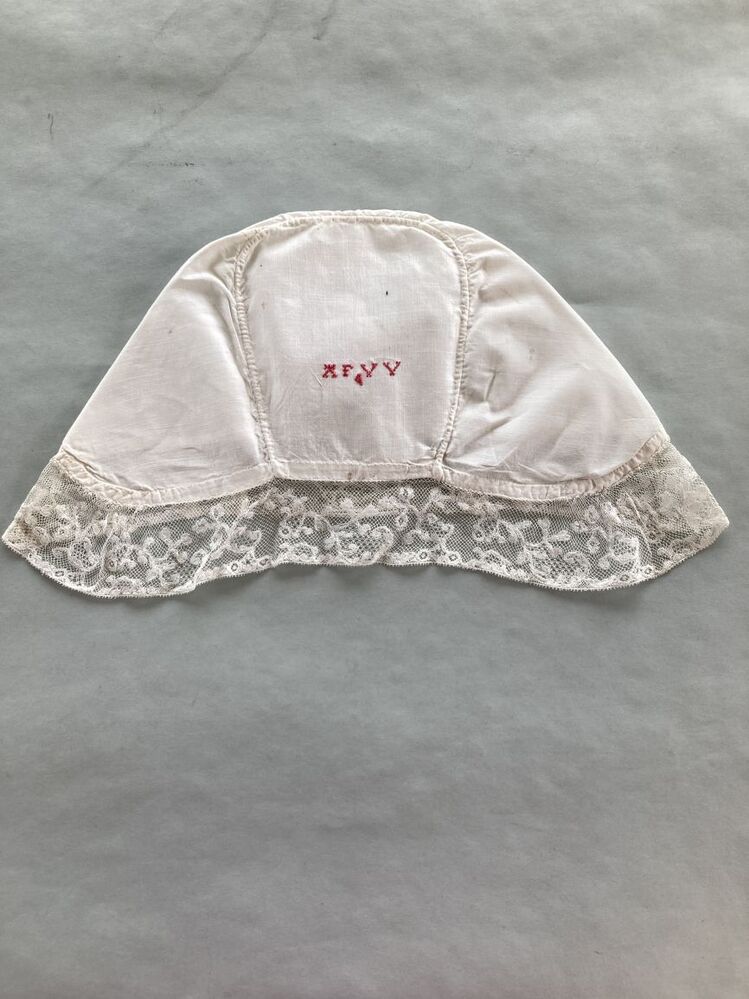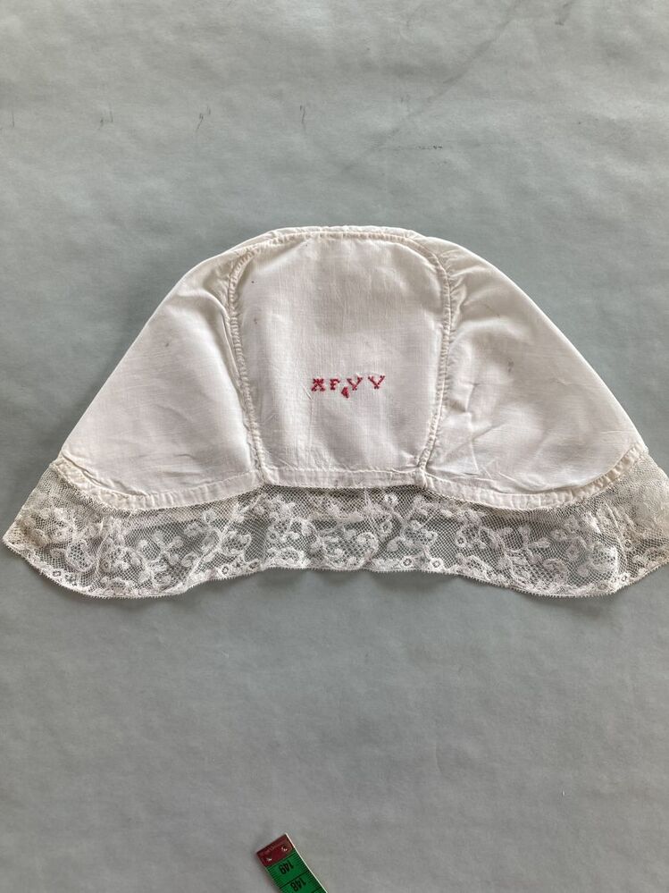 Tipmuts van wit katoen, handgenaaid, rondom Rijsselse potkant en machinale kant