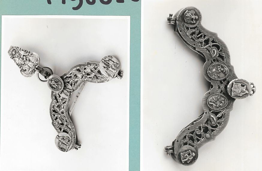 Zilveren tasbeugel versierd met zaagwerk en medaillons waaarin bijbelse voorstellingen