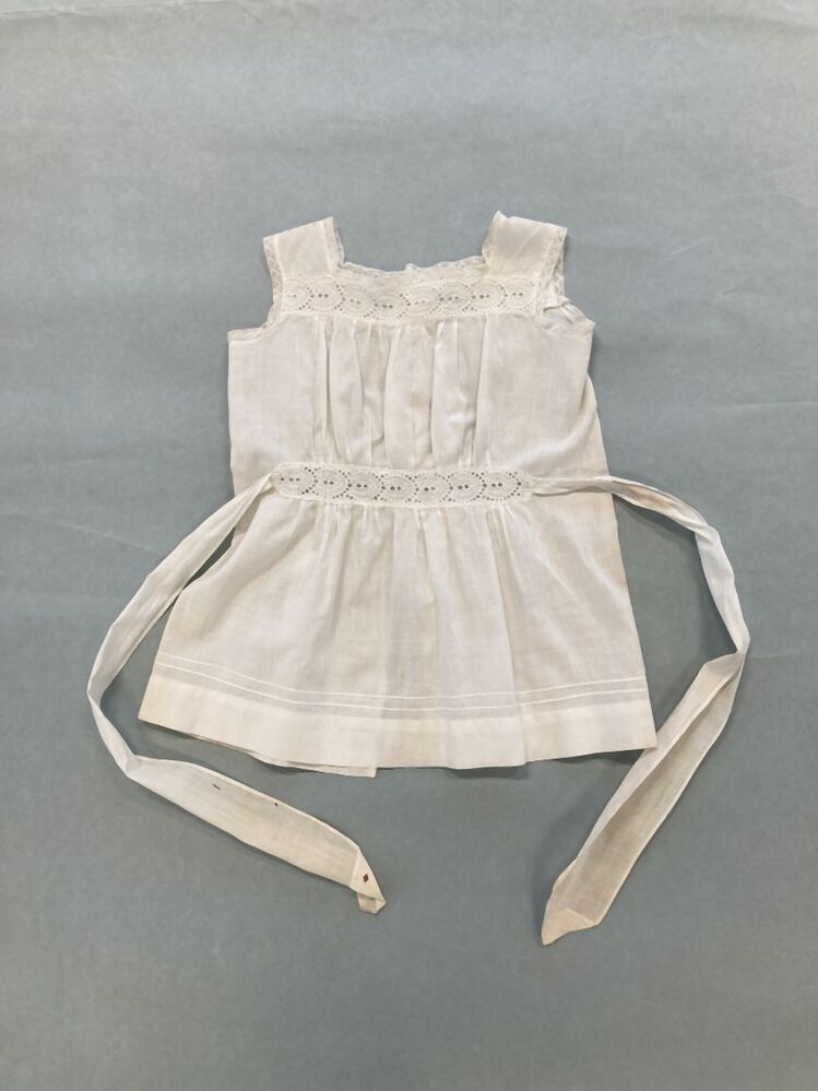 Kinderboezelaar van wit batist met schouderpas en broderie