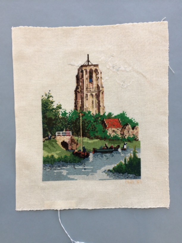Borduurlap met kruissteekborduursel voorstellende de Oldehove met op voorgrond groen, huizen, water en schepen