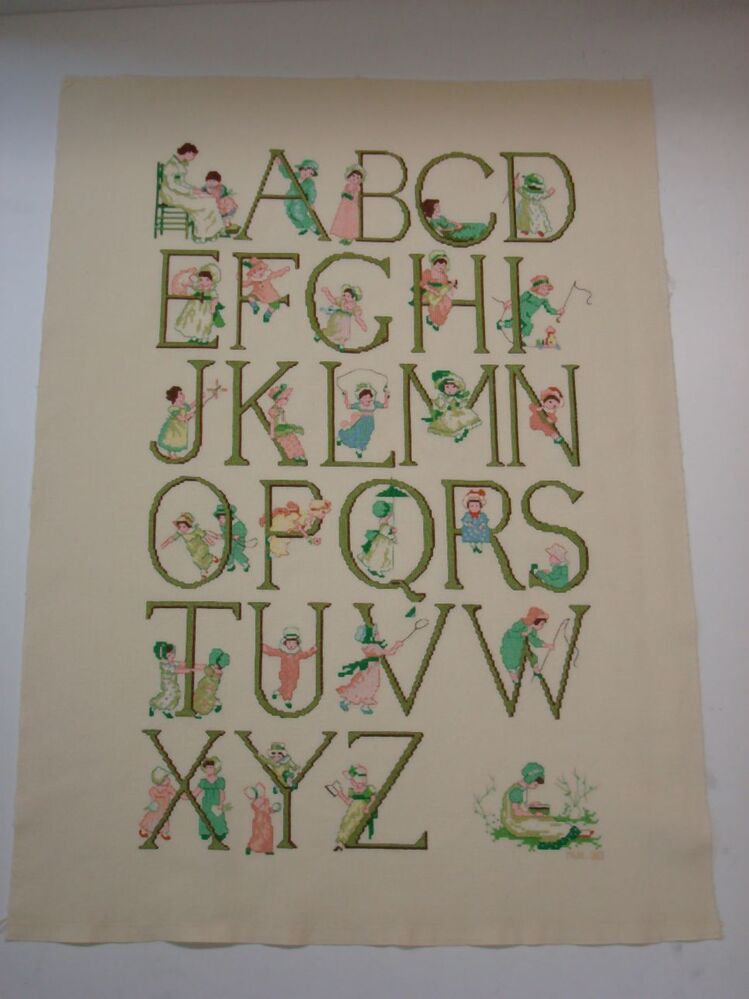 Lettermerklap van Lanarte pakket (33226), in kruissteek, 1 alfabet met spelende en lezende kinderen