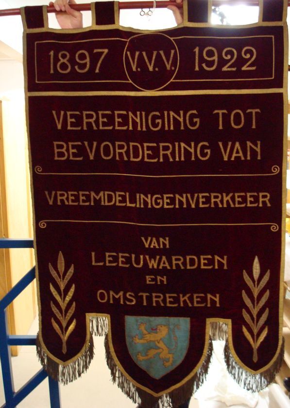 Vaandel waarop 1897 VVV 1922 VEREENIGING TOT BEVORDERING VAN VREEMDELINGENVERKEER VAN LEEUWARDEN EN OMSTREKEN