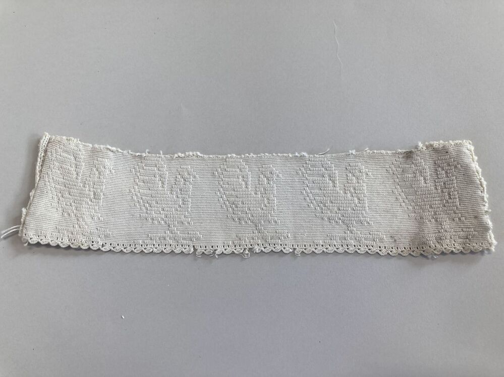 Tipmuts van dun katoen, in de lengte gehaakt in reliëfstokjes met vijf haantjes, onderdeel van groep van vierentwintig