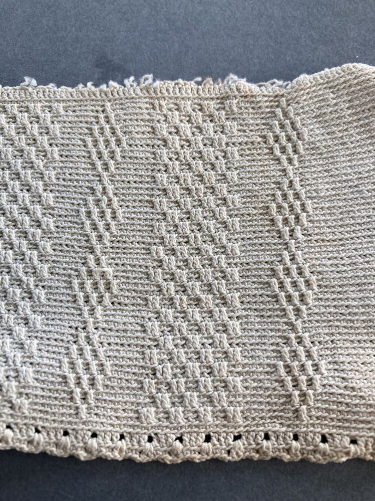Tipmutsstrook van dun katoen, in de breedte gehaakt met banen in reliëfstokjes