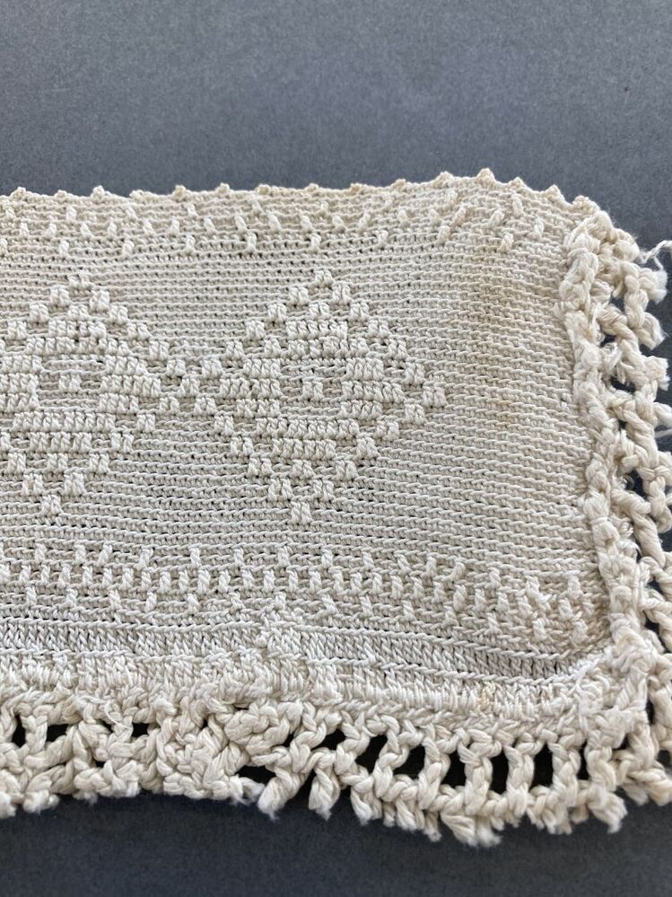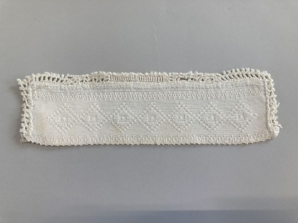 Tipmuts van dun katoen, in de lengte gehaakt in reliëfstokjes met ruitmotief