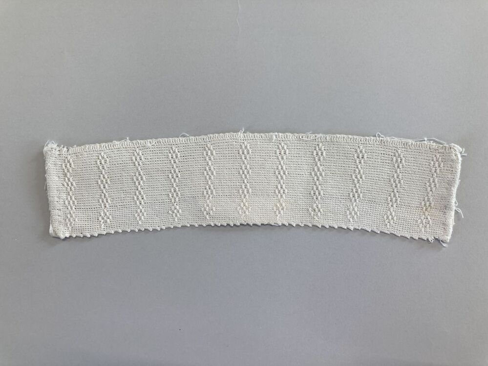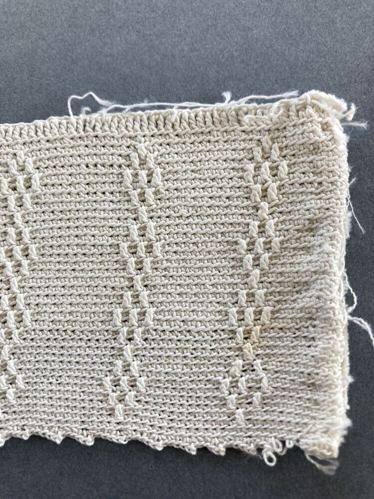 Tipmuts van dun katoen, in de lengte gehaakt in reliëfstokjes, met vertikale strepen