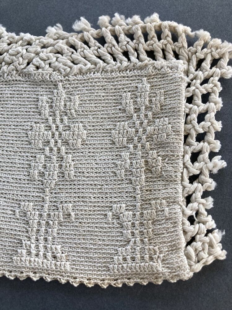 Tipmutsstrook van dun katoen, in de lengte gehaakt in reliëfstokjes,