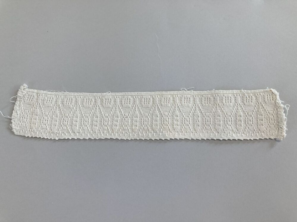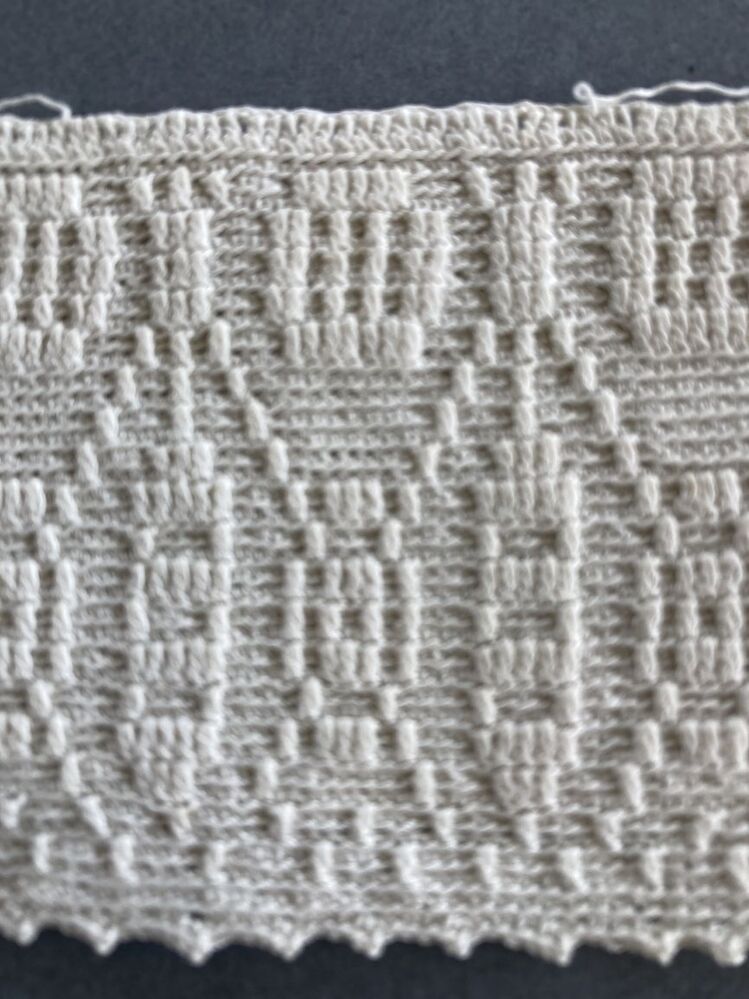 Tipmuts van dun katoen, in de lengte gehaakt in reliëfstokjes, met geometrische motieven