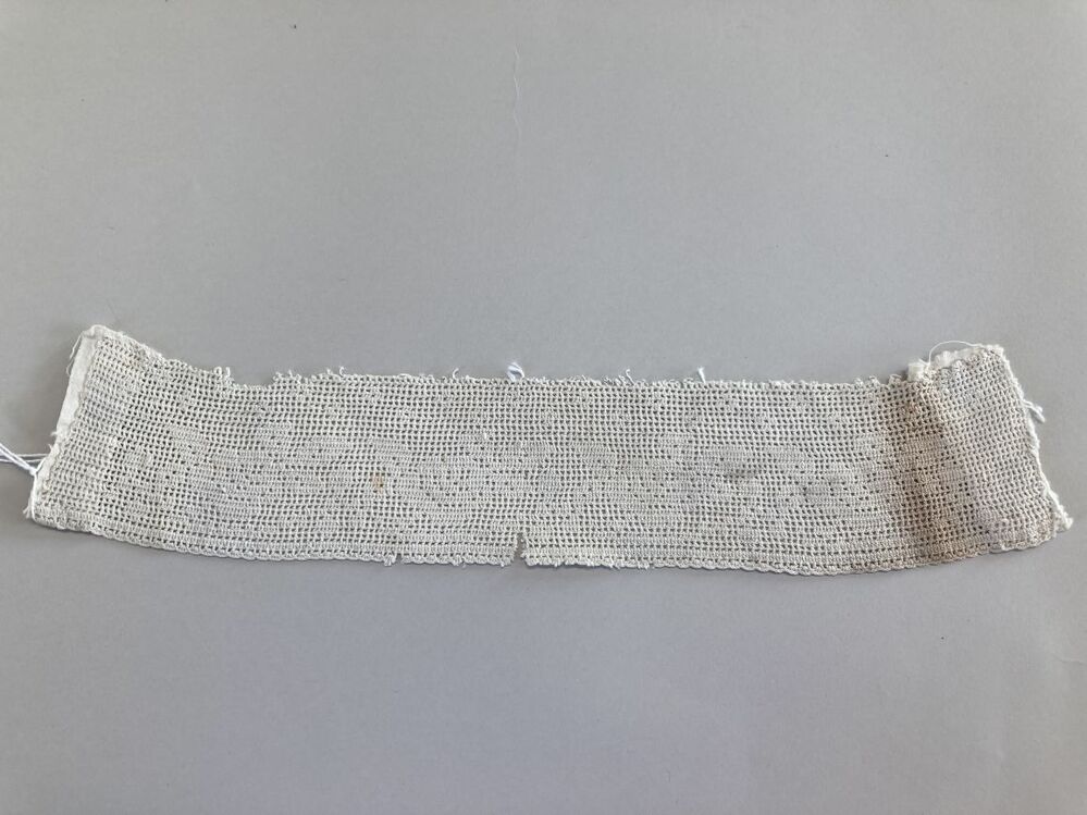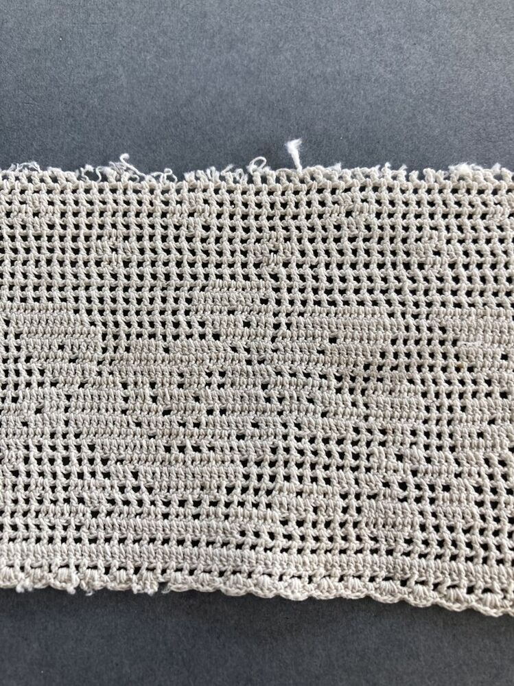 Tipmutsstrook van dun katoen, roosmotief in filethaakwerk