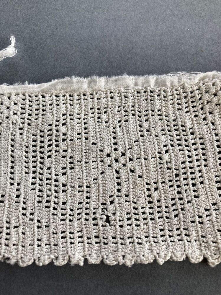 Tipmuts van dun katoen, rozetmotief in filethaakwerk