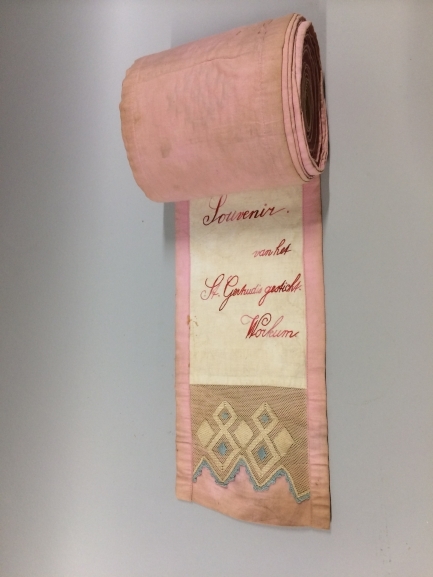Drieëntachtig aan elkaar genaaide proefstukken in verschillende technieken, gevoerd met roze katoensatijn