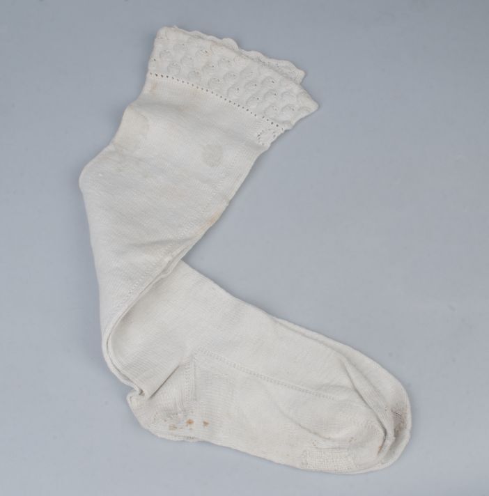 Enkele kous van dun wit katoenen garen, met ajour strepen