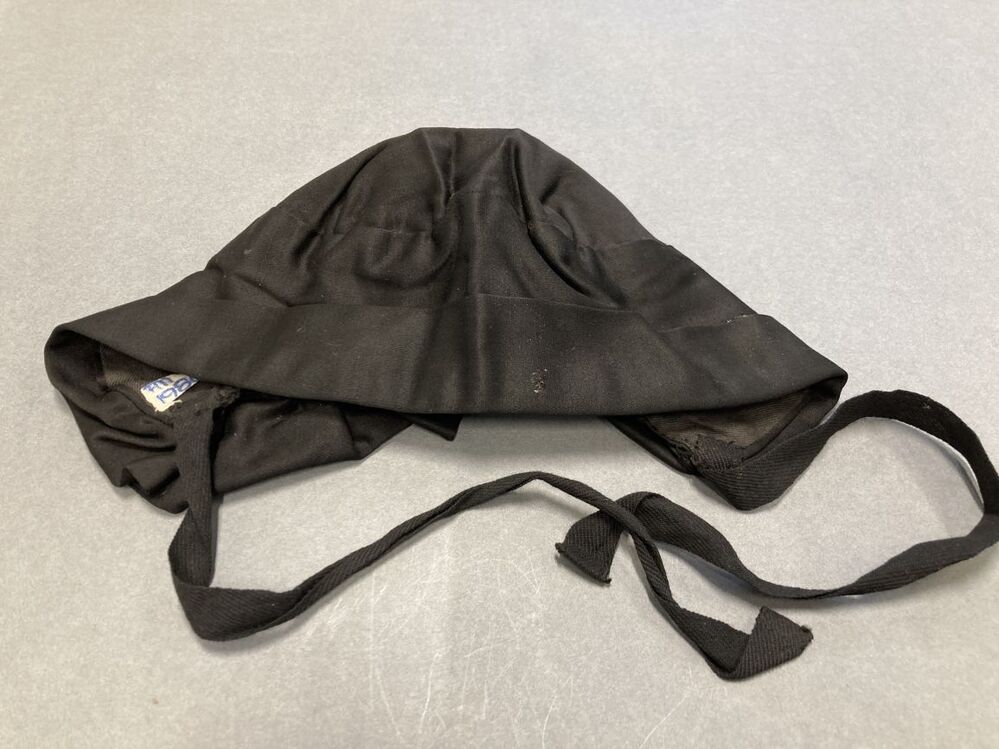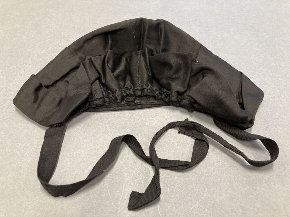 Nauwsluitende zwart satijnen rouwmuts met omslag langs gezicht en geplooide rand langs onderkant, met kinbanden, gevoerd met katoen