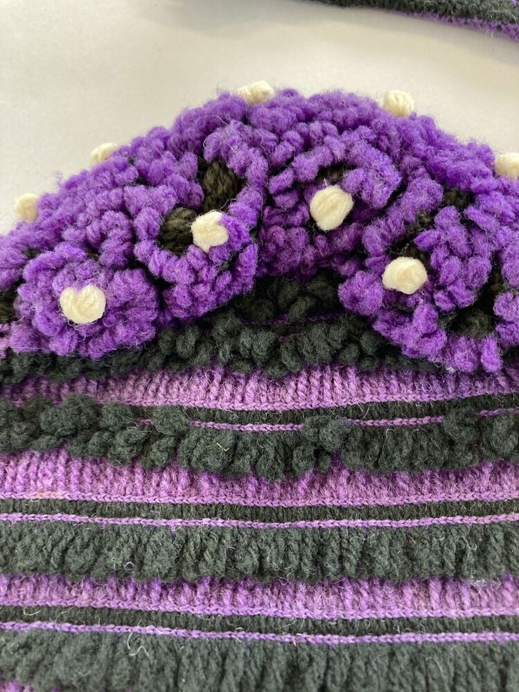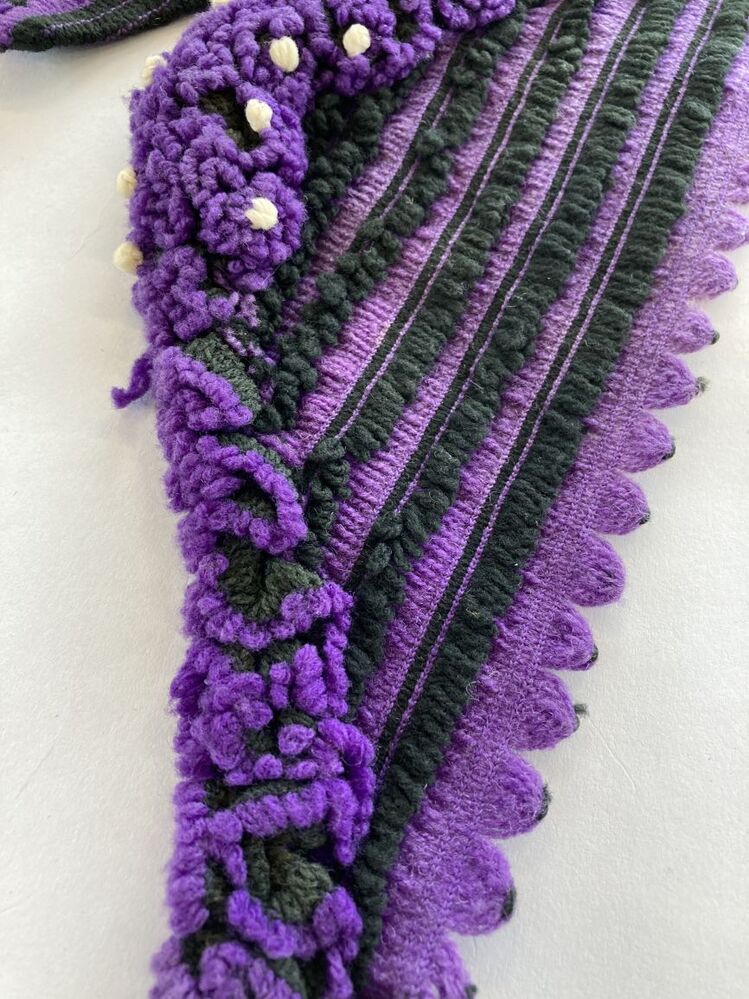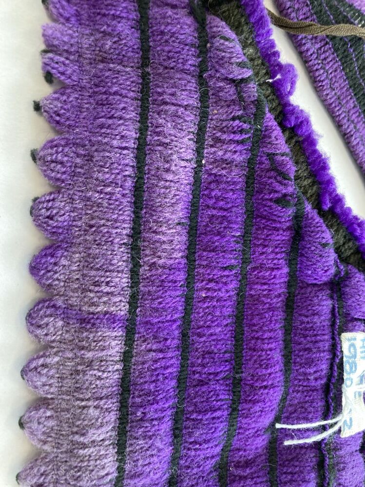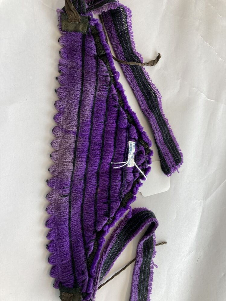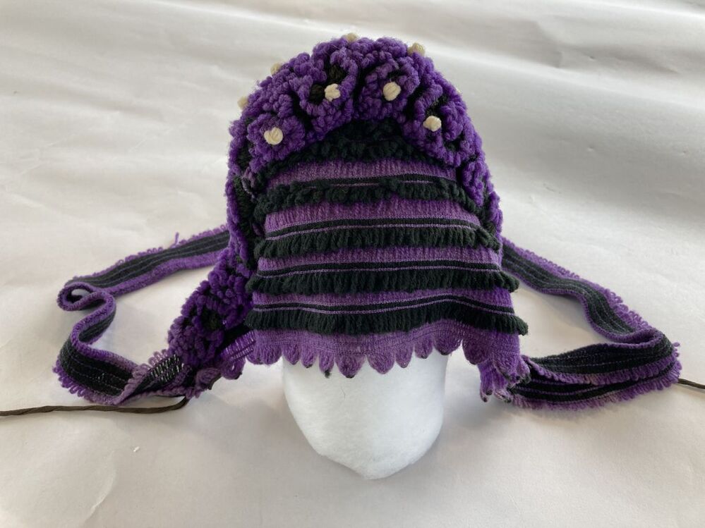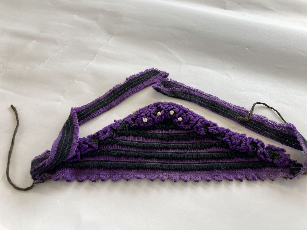 Driehoekig mutsje of fanchon van paarse en zwarte wol met kinbanden