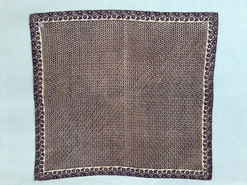 Vierkante bedrukte katoenen doek bedrukt ib twee paarstinten, middenveld geschakelde zeshoeken, rondom smalle rand met zigzag-bloemrank