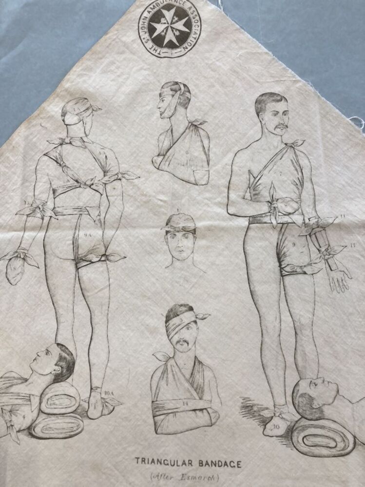 Mitella, bedrukt met grijze inkt een voorstelling van personen die demonstreren hoe de doek te gebruiken is