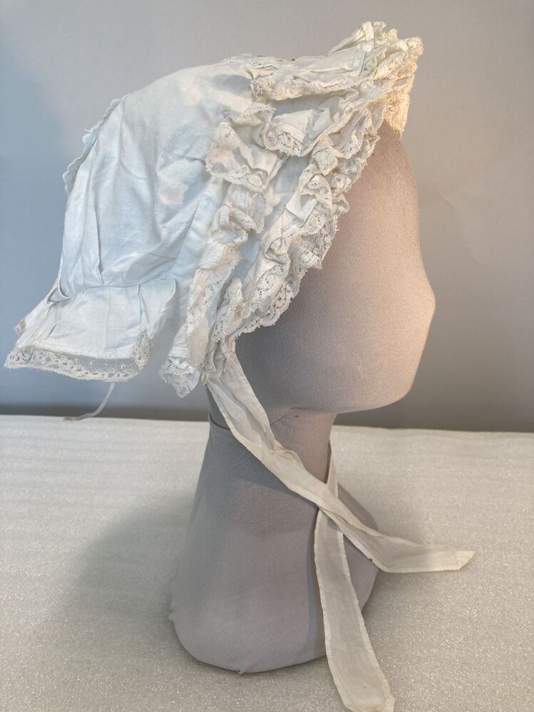 ochtendmuts van wit katoen, versierd met broderie en machinaal kloskant langs geplooide stroken