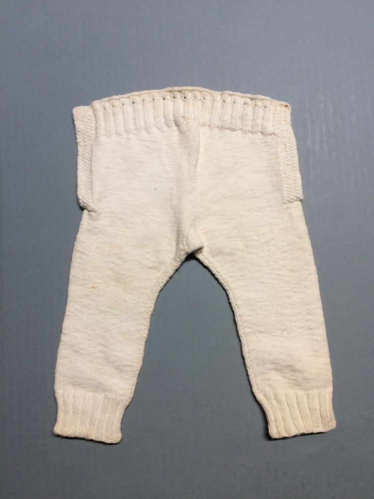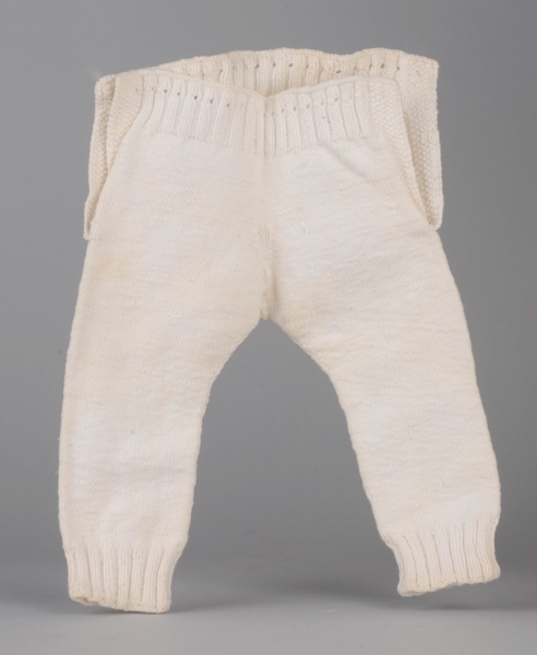 Onderbroek, gebreid wit katoen, lange pijpen en twee splitten, binnengekomen als groep van zes onderbroeken