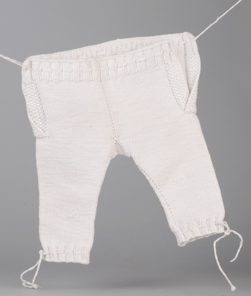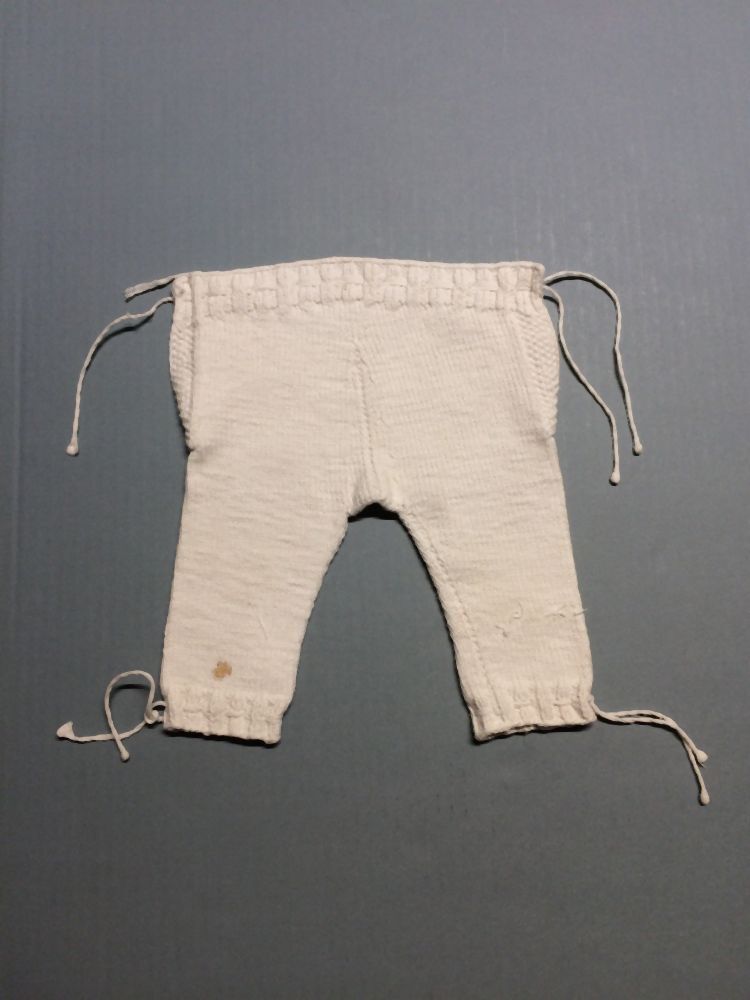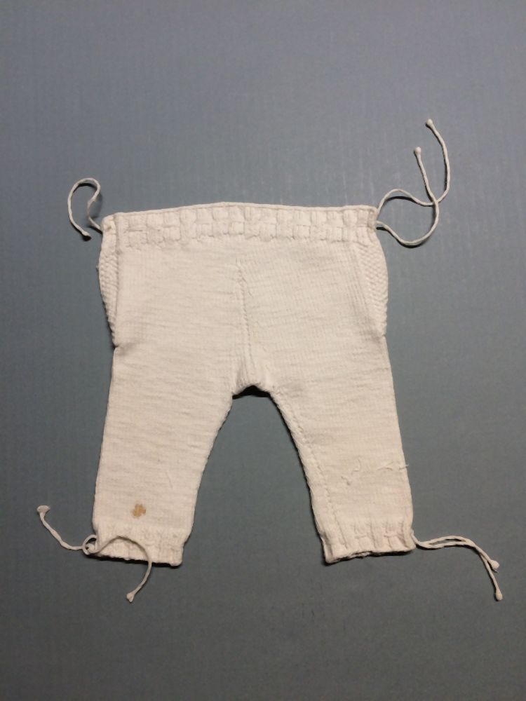 Onderbroek, gebreid wit katoen, lange pijpen en twee splitten, binnengekomen als groep van zes onderbroeken