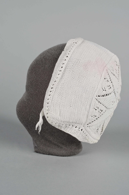 Muts van wit katoen, breiwerk, ajourster in cirkel, achtpuntig, onderdeel van groep van drie