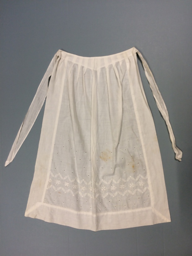 Schortje van wit batist, broderie randmotief, rondom afgezet met 6 cm brede bies van effen batist