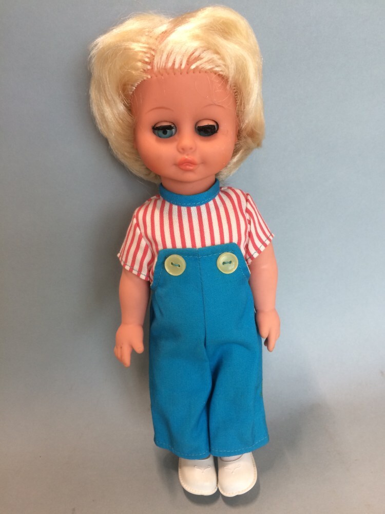 Staand popje met hoofd en armen van vinyl, blond nylon haar in broekpak