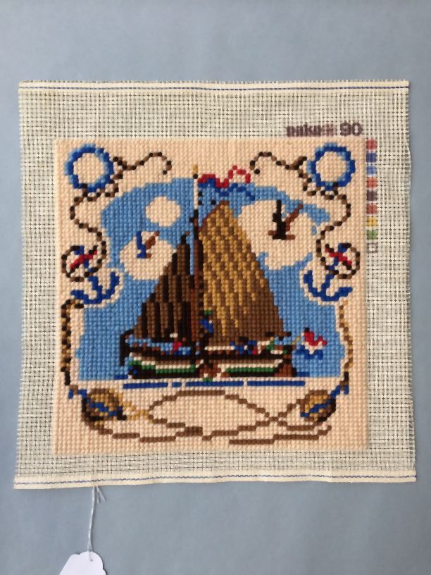 Borduurstuk op wit katoenen stramien met kruissteken van wol, motief is een skûtsje met bruine zeilen