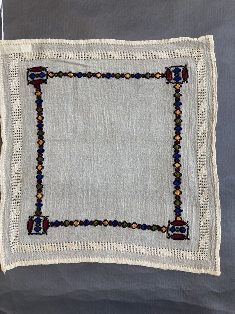 Vingerdoekje van crêpe katoen, met veelkleurig kruissteekborduursel en open naaiwerk
