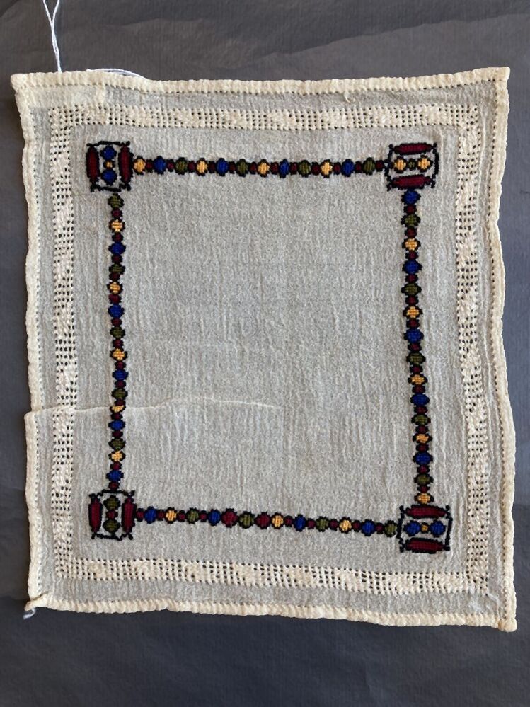Servetje van katoen, met kruissteek en open naaiwerk in zwart, geel, rood, blauw, groen en roze vierkanten en ruiten