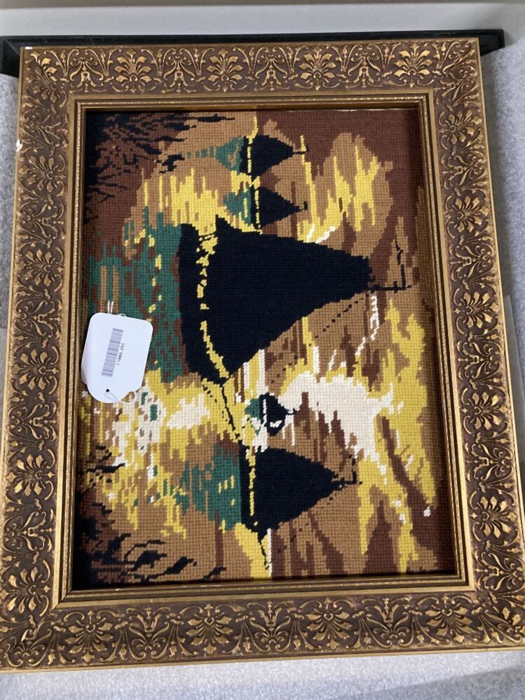 Borduurstuk in halve kruissteek met wol op stramien vier, voorstellende een meer bij ondergaande zon, waarop vijf silhouetten van zeilschepen