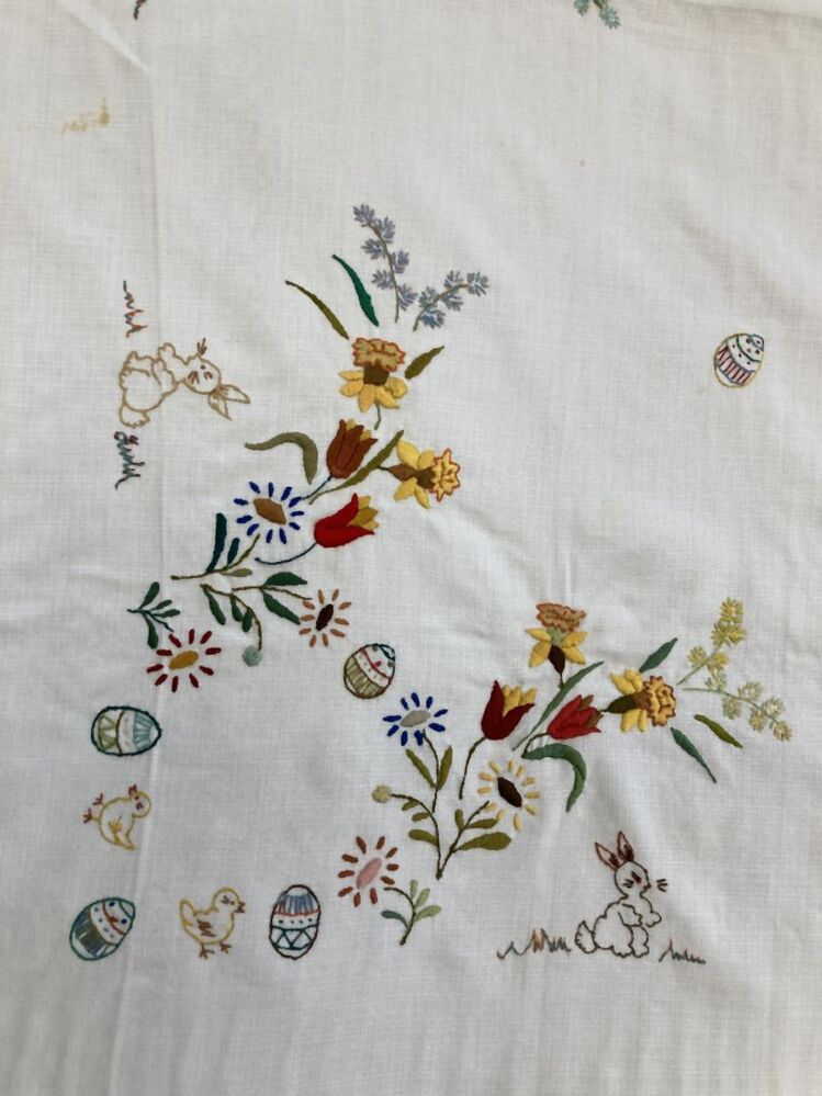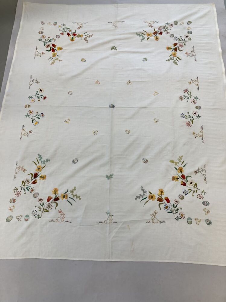 Tafelkleed van katoen met voorbedrukte paasmotieven, haas, eieren, kuikens, wilgentakjes en bloemen in knop