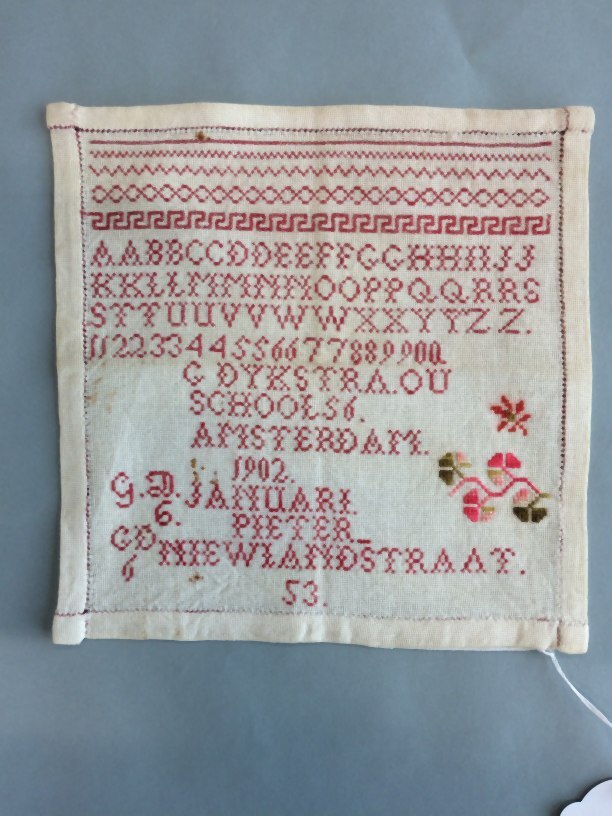 Letterlapje, katoen op stramien, 1902, bloemmotief, letterranden, G.Dijkstra OU / school 56 / Amsterdam / GD / 1902 / 6 januari / Pieter Nieuwlandstraat / 53