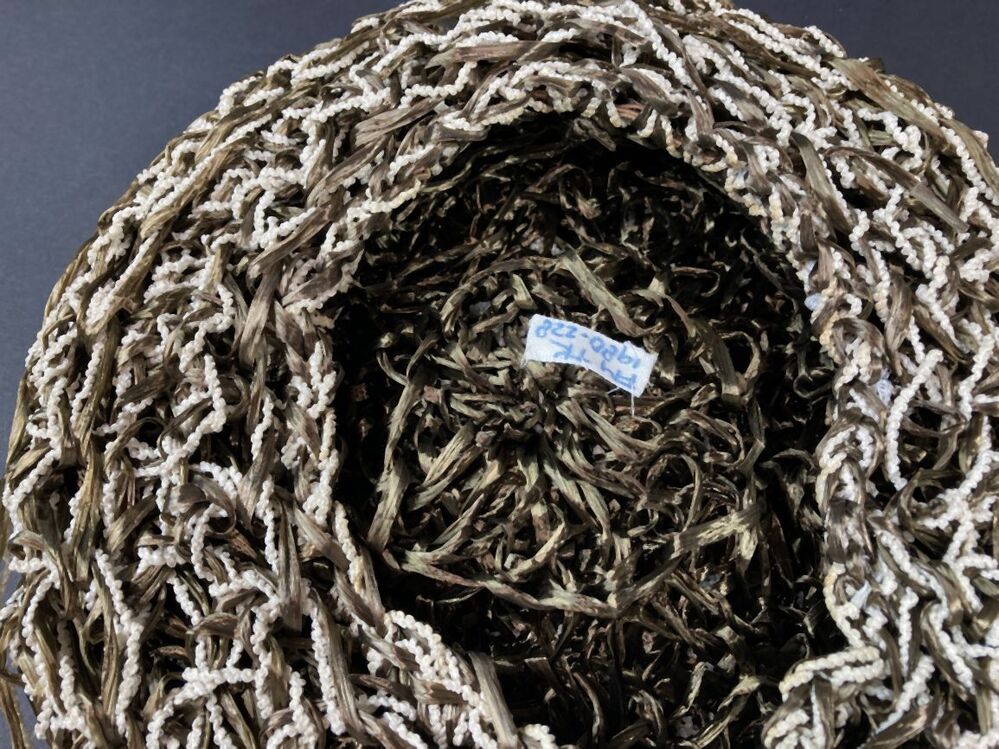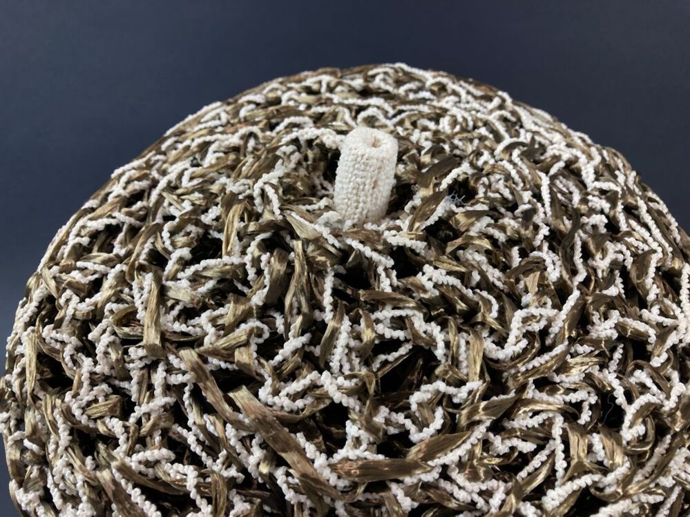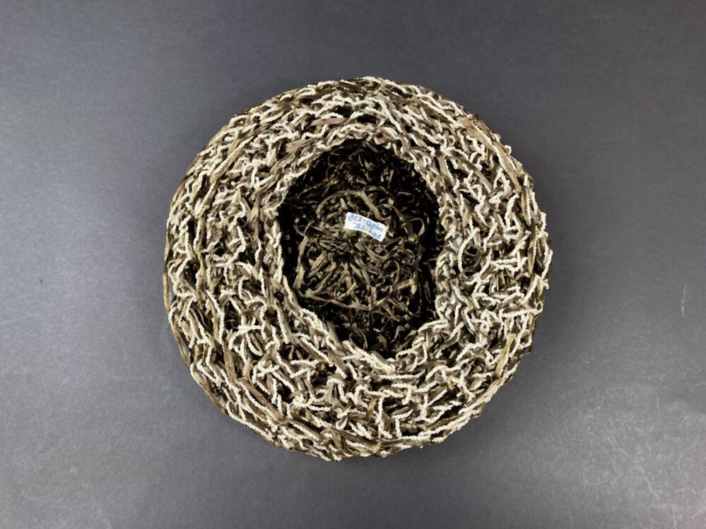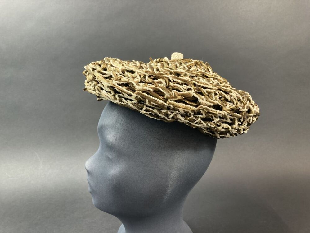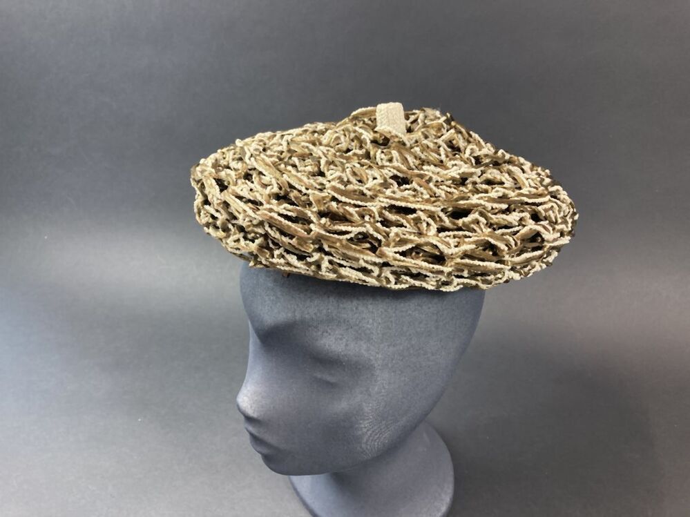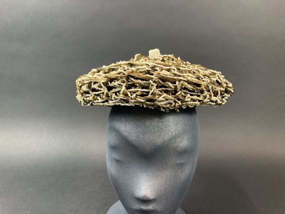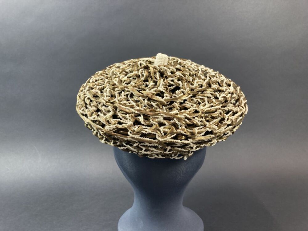 Bruine hoed van gevlochten stro-achtige kunstvezel en wit bouclégaren, kokertje omwoeld met bouclé bovenop