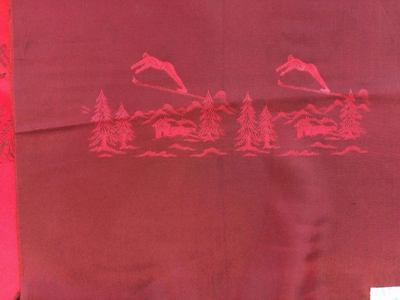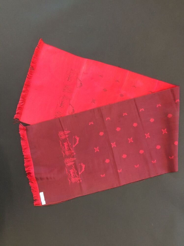 Langwerpige satijnen rode sjaal met zwarte bladmotieven en rand met ski-springers