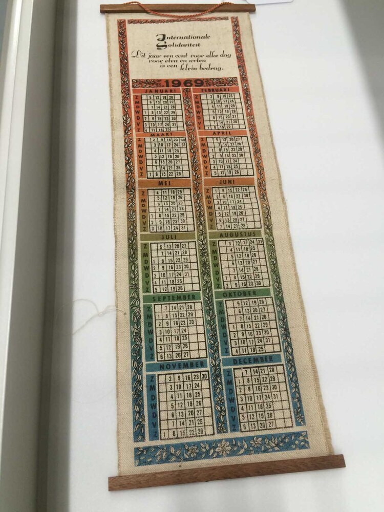 Kalender 1969, halflinnen, bedrukt met oranje, via groen verlopend naar blauw, oranje ophangkoord