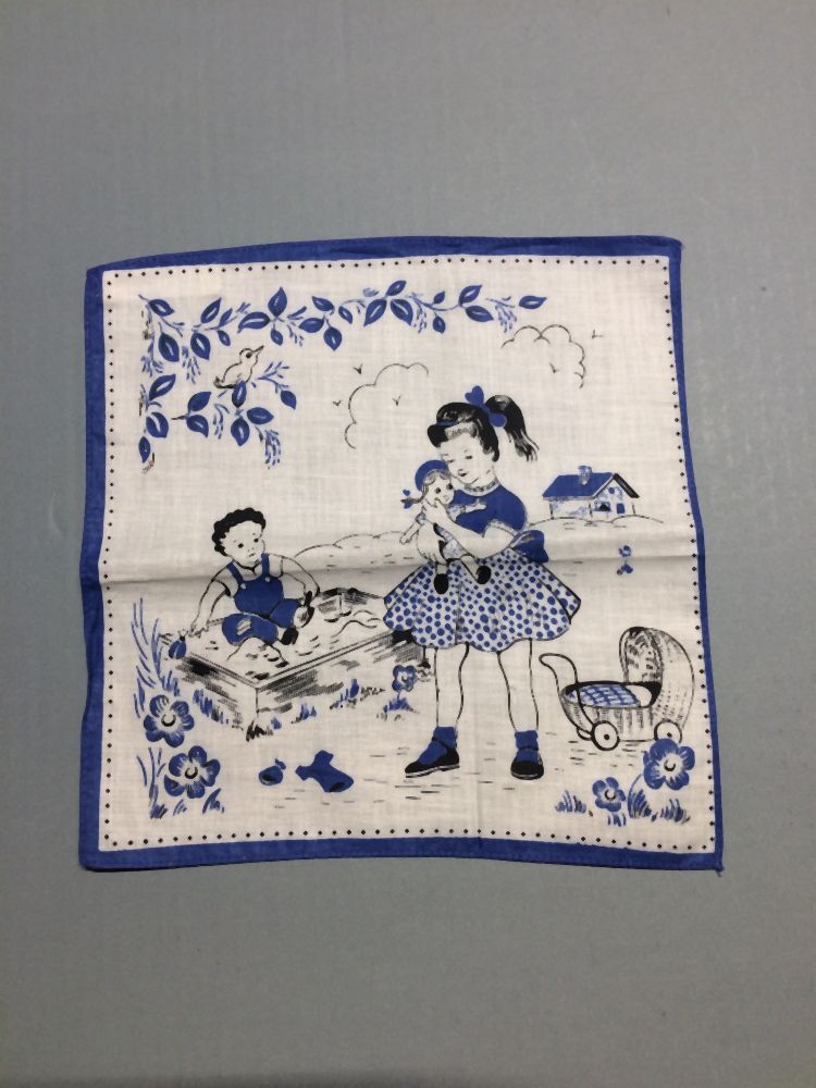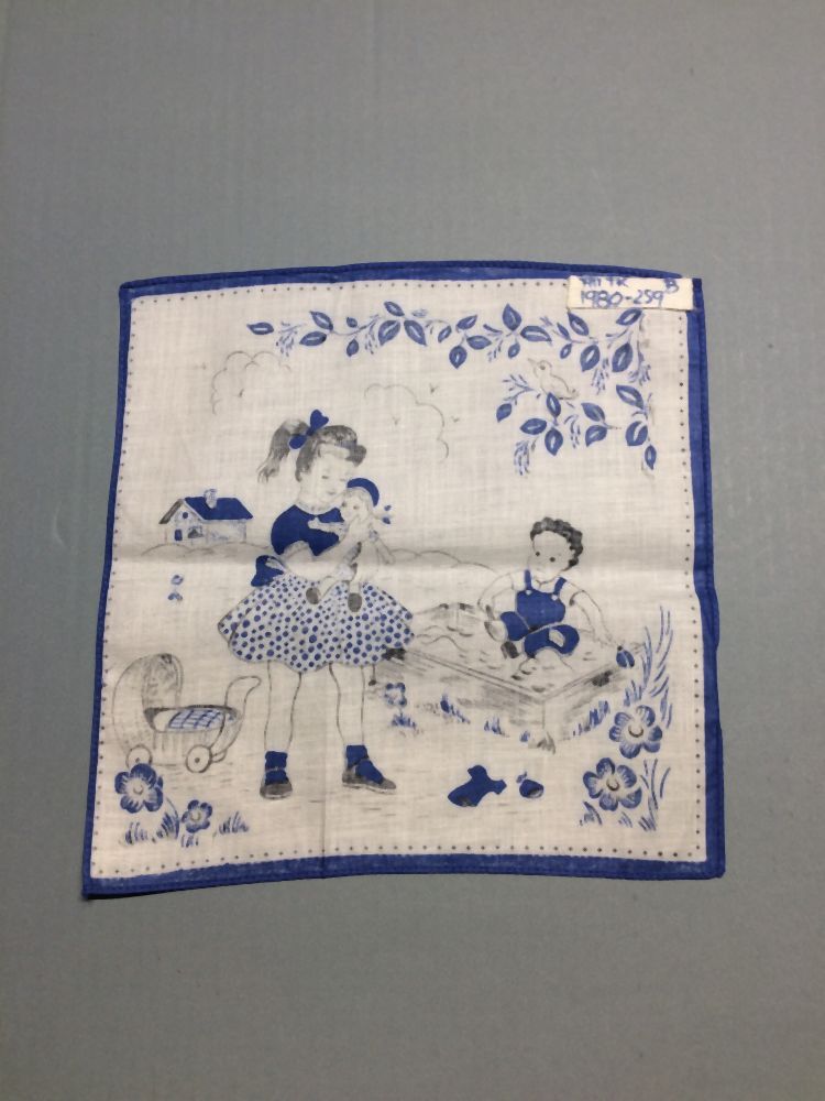 Zakdoek, wit met rood of blauw tafereel met twee kinderen, onderdeel van groep van zes