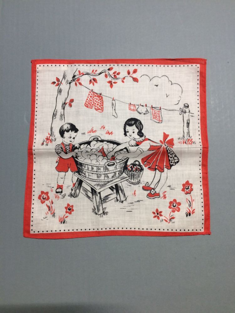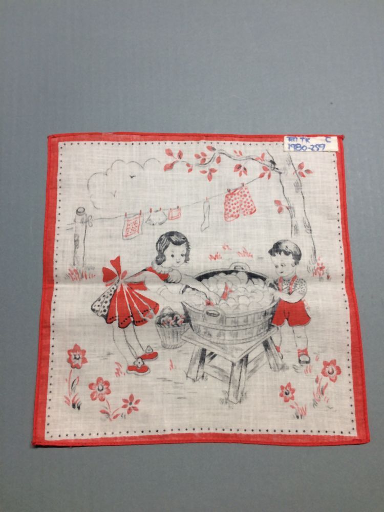 Zakdoek, wit met rood of blauw tafereel met twee kinderen, onderdeel van groep van zes