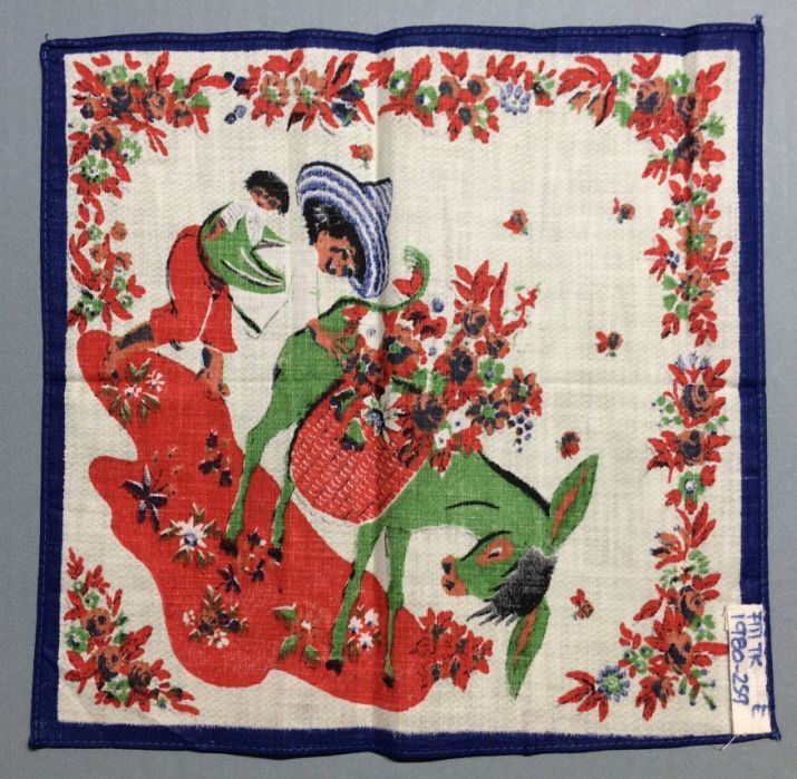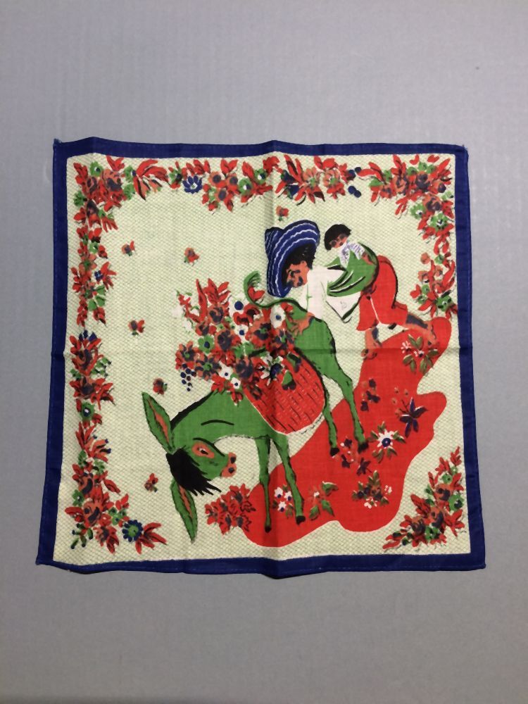Zakdoek, groen/blauw/rood/roze tafereel diagonaal, ezel, onderdeel van groep van zes