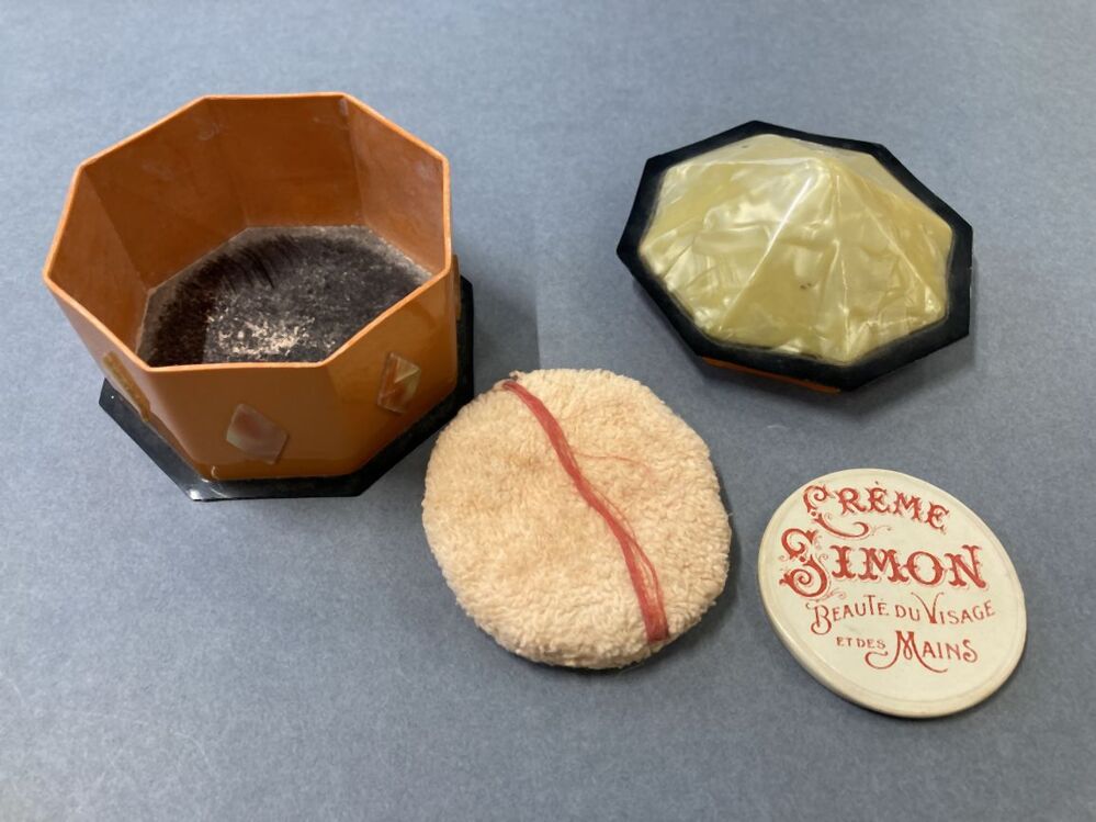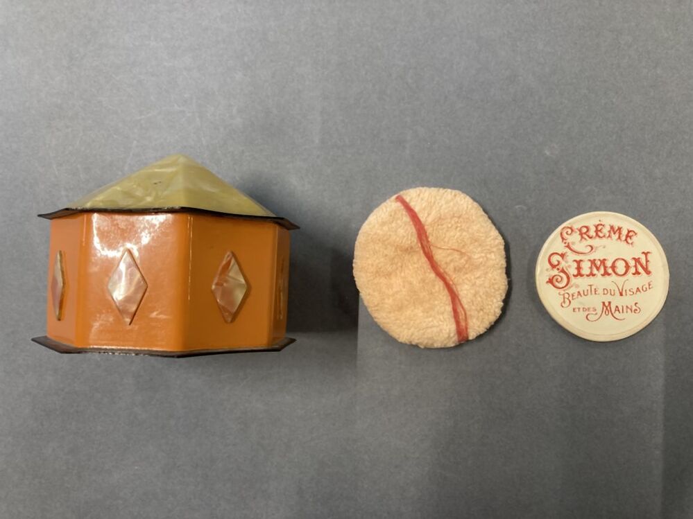 Accessoires voor het op het lichaam dragen van cosmetica. Meestal zijn ze gemaakt van metaal of plastic, en ze kunnen vrij decoratief zijn. De binnenkant bevat meestal een spiegel in het deksel van de ene helft en gezichtspoeder in de andere helft, maar kan ook vakjes hebben voor rouge of lippenstift, of een onderdeel voor de bevestiging van een lippenstiftkoker. (AAT-Ned)