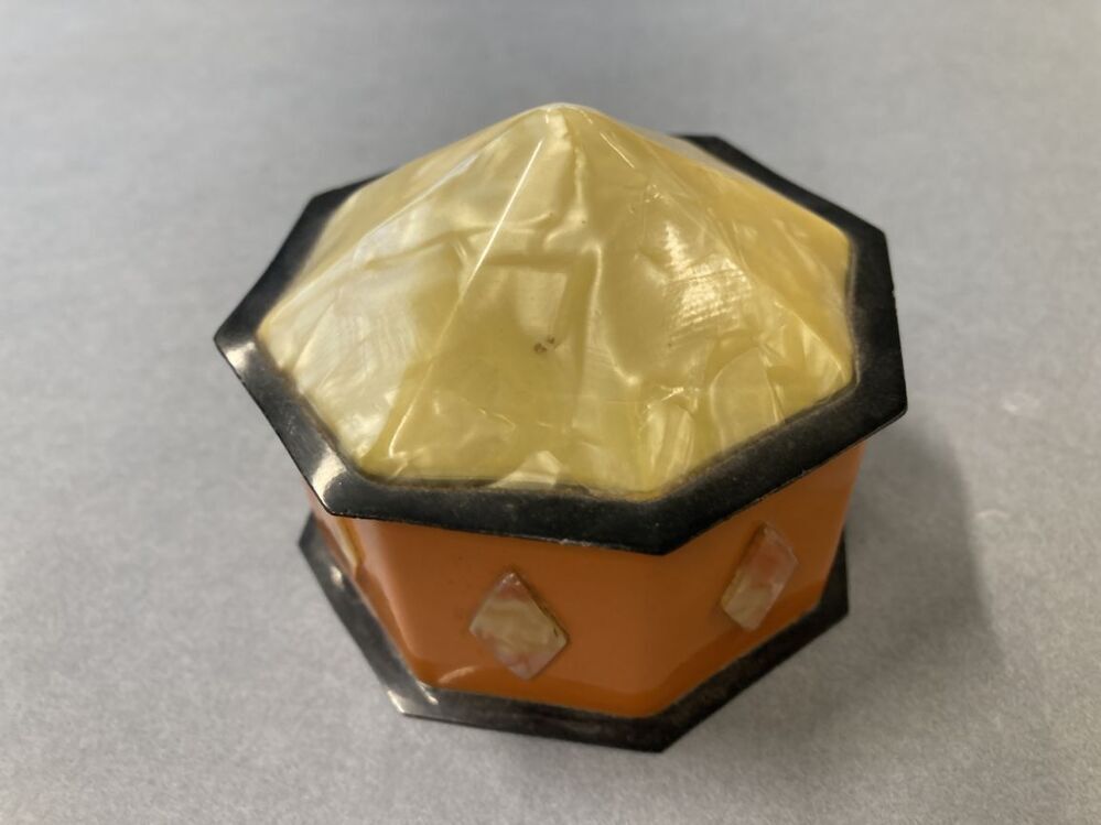 achthoekige poederdoos van kunststof, met in punt lopend deksel met parelmoer-effect.