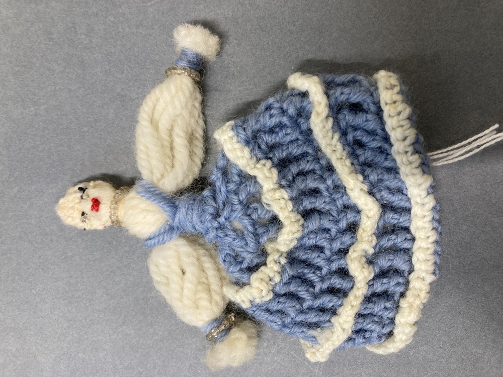 Popje, gewikkeld van wollen garen, met gehaaktelichtbaluwe jurk