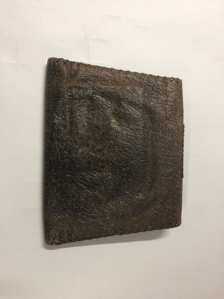 Donkerbruine trapeziumvormige enveloppetas zonder handvat van leer met grove nerf (olifant?), afgezet met slangenleer