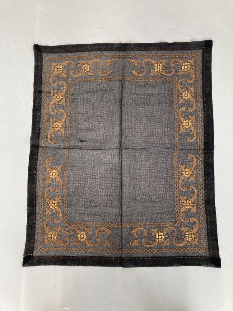 Kleedje van zwart katoen gaas met okergeel geborduurde rand in doorstoptechniek